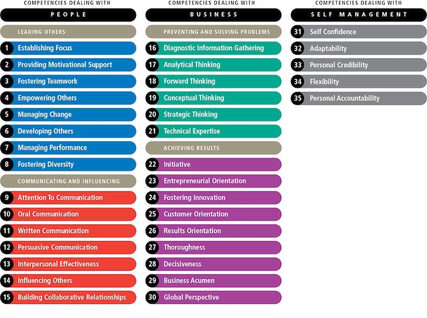 This Competency Dictionary with levels is divided into three groups and four sub-groups (or clusters):