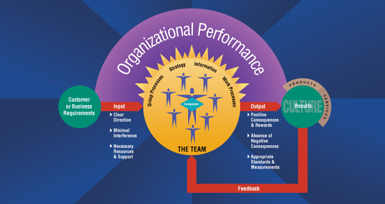 This same system applies to the performance of a group of individuals who make up a team or an entire organization. Only this time, individuals need to work together to produce output, and issues such as group processes, strategy, information flow and work processes must be managed in order for the team to be productive.
