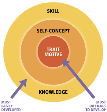 Competencies exist at various levels. As shown in the graph below, skills and knowledge exist at the behavioral or outermost level; social role and self-image exist at an intermediate level; and motives and traits exist at the deepest, or core, level.
