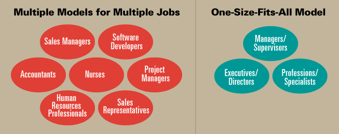But the one-size-fits-all approach also has significant disadvantages. One-size-fits-all models often describe values that are espoused or wished for, rather than describing what it truly takes to be effective in a job. I have seen many organizations with a conspicuous lack of teamwork include a “Teamwork” competency in a one-size-fits-all model, even though superior performers are more likely to need political savvy and a “thick skin.” Another disadvantage is that employees may believe that the model does not really apply to their own job. They may become skeptical or even cynical about the model. Finally, one-size fits-all models are not as useful as job-specific models in guiding selection and development for a particular job.